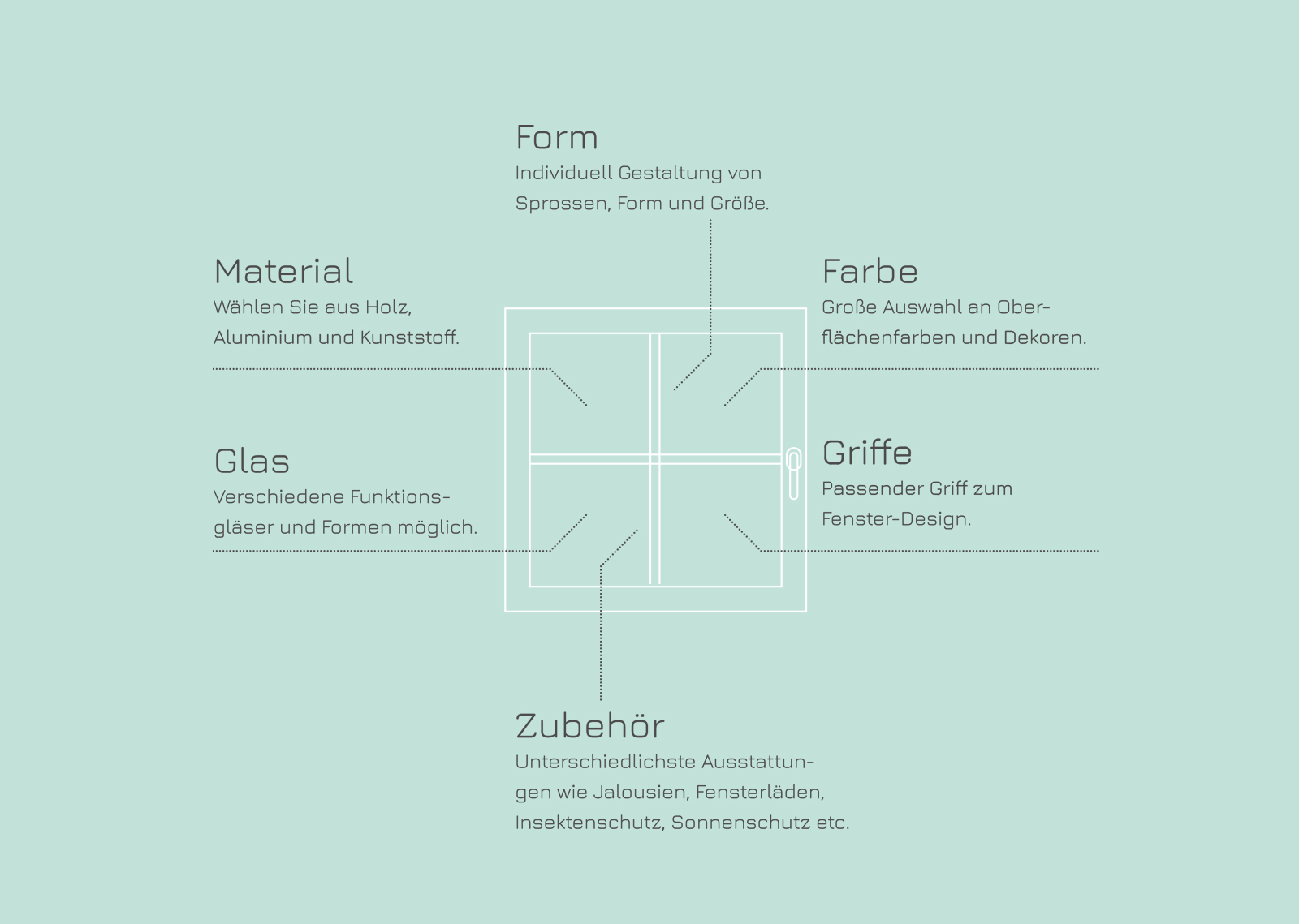 Ganz nach Gusto stellen wir für Sie das perfekte Fenster zusammen. Ob Farbe, Form oder Material, die Auswahl ist groß und Ihrer Kreativität sind fast keine Grenzen gesetzt. Um die beste Lösung zu finden, stehen wir Ihnen gerne mit Rat und Tat zur Seite.